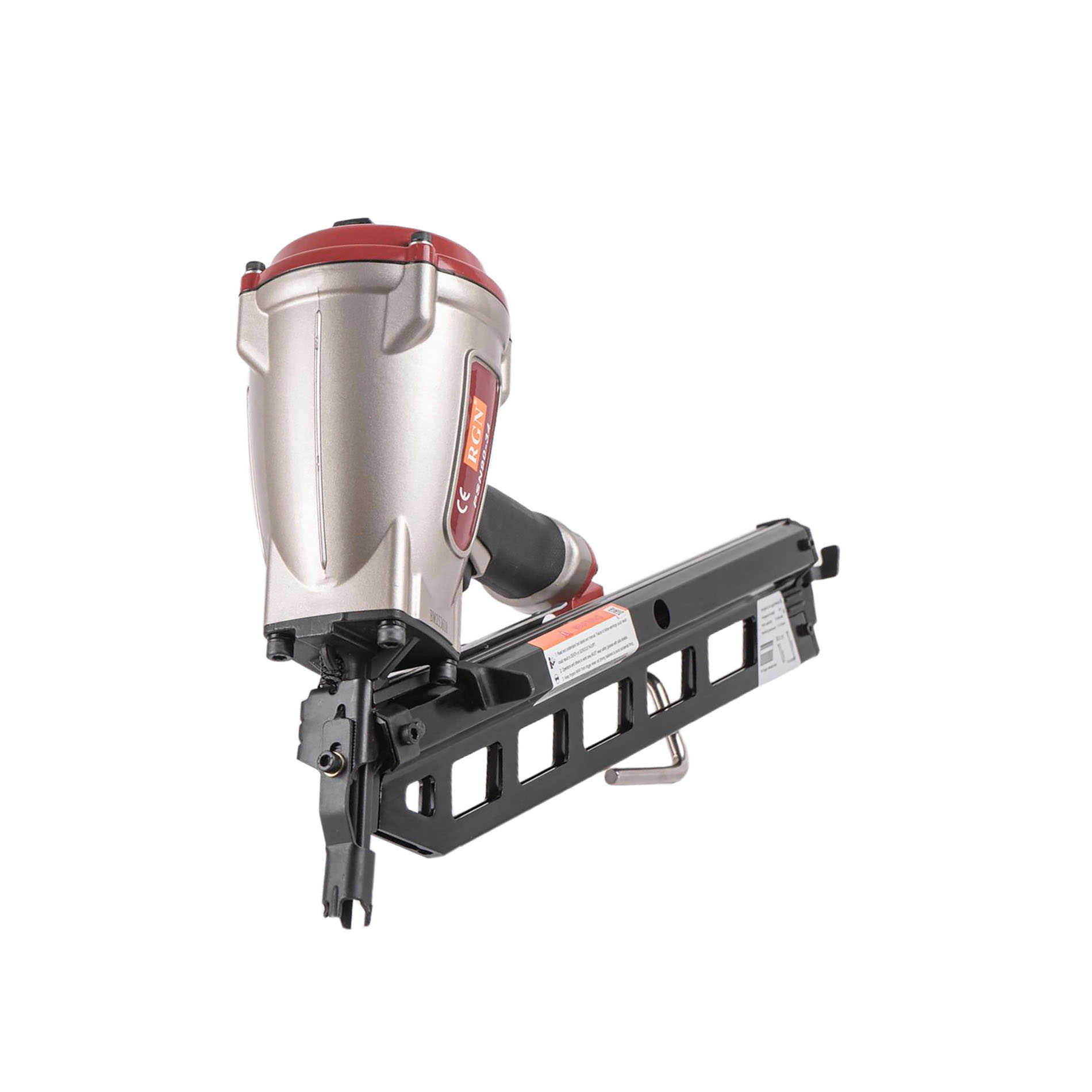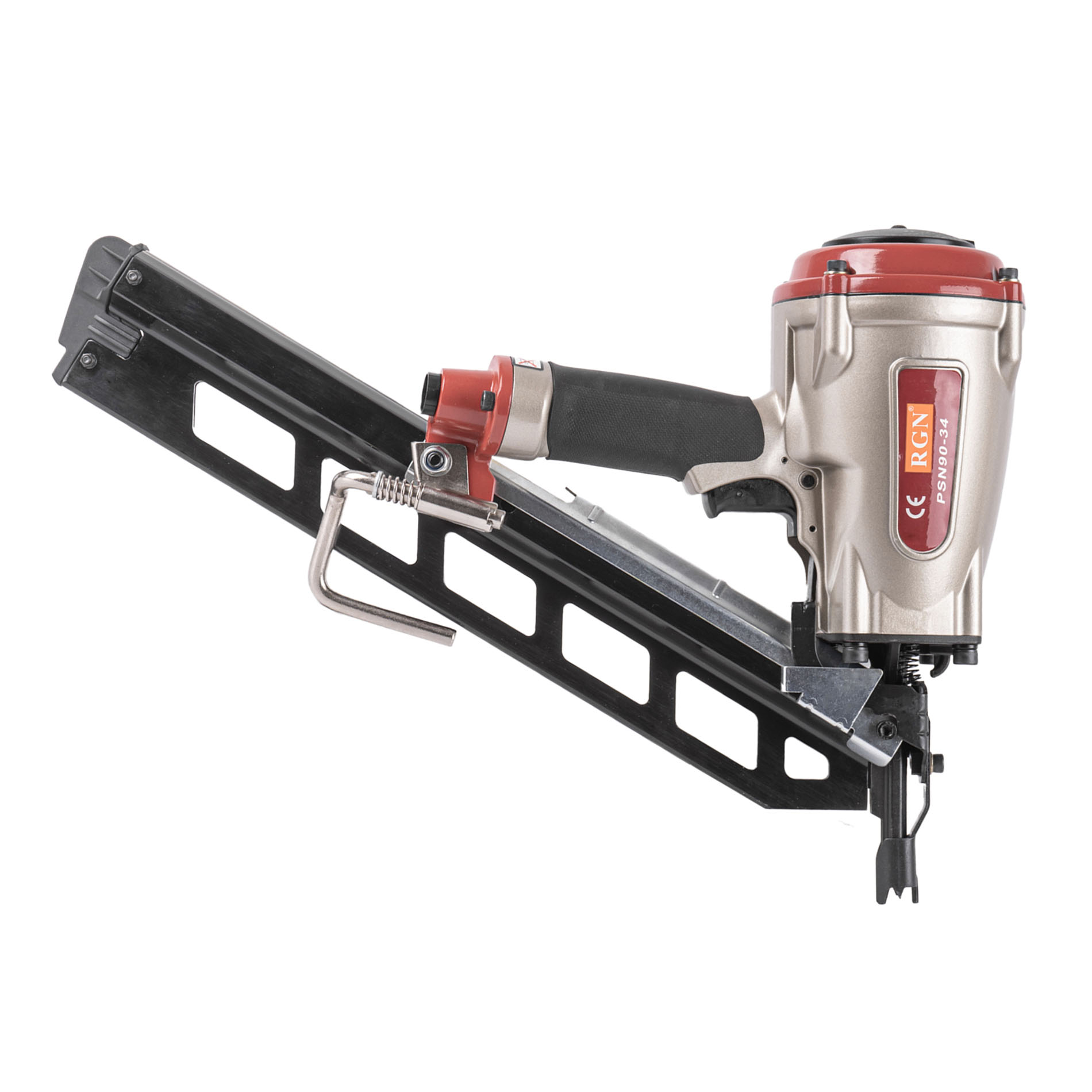 Гвоздезабивной пневматический реечный пистолет RGN PSN9034 для реечных гвоздей в пластиковой обойме с углом наклона 34° и длиной 50-83 мм. Инструмент идеально подойдет для применения в деревянном и каркасном домостроении. Емкость реечного магазина 94 гвоздя, это сравнительно немного и именно поэтому масса снаряженного гвоздями пистолета невелика, что позволяет чрезвычайно удобно оперировать им в труднодоступных местах, в неудобном положении и на вытянутых руках. Инструмент чрезвычайно надежен и прост, его эксплуатация не требует специальных знаний и навыков. Зубчатые зацепы носика предотвращающие его "соскальзывание" с пристреливаемой поверхности, контактный предохранитель исключающий случайный выстрел, регулировка глубины забивания.