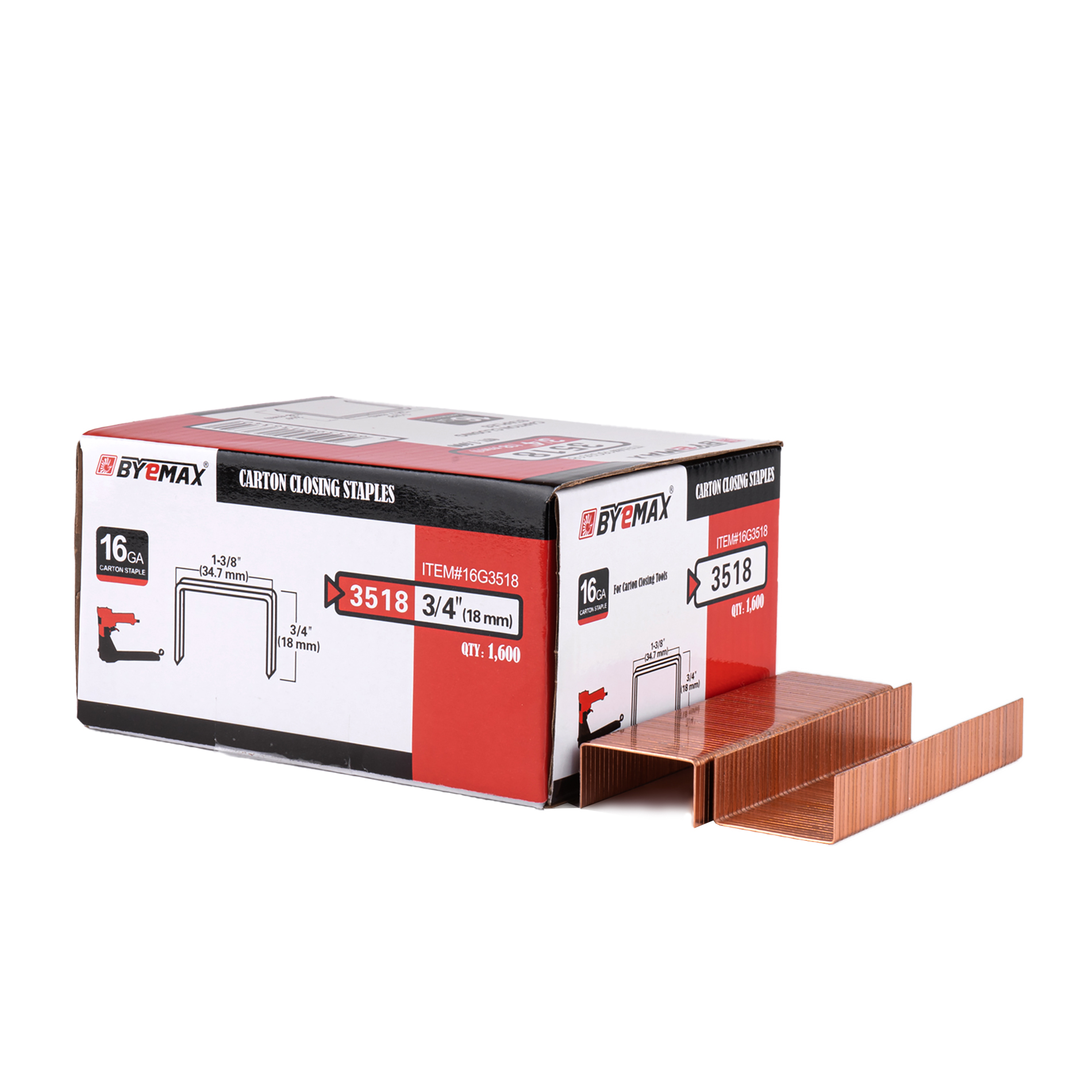 Скобы упаковочные Byemax для гофрокартона тип 35, ширина спинки 34,7 мм, длина ножки 18 мм (калибр 16Ga), для пневматических и ручных скобозажимных инструментов. Широко применяются для сшивания гофротары, имеет медное покрытие. Количество в упаковке 1600 штук. 16G3518