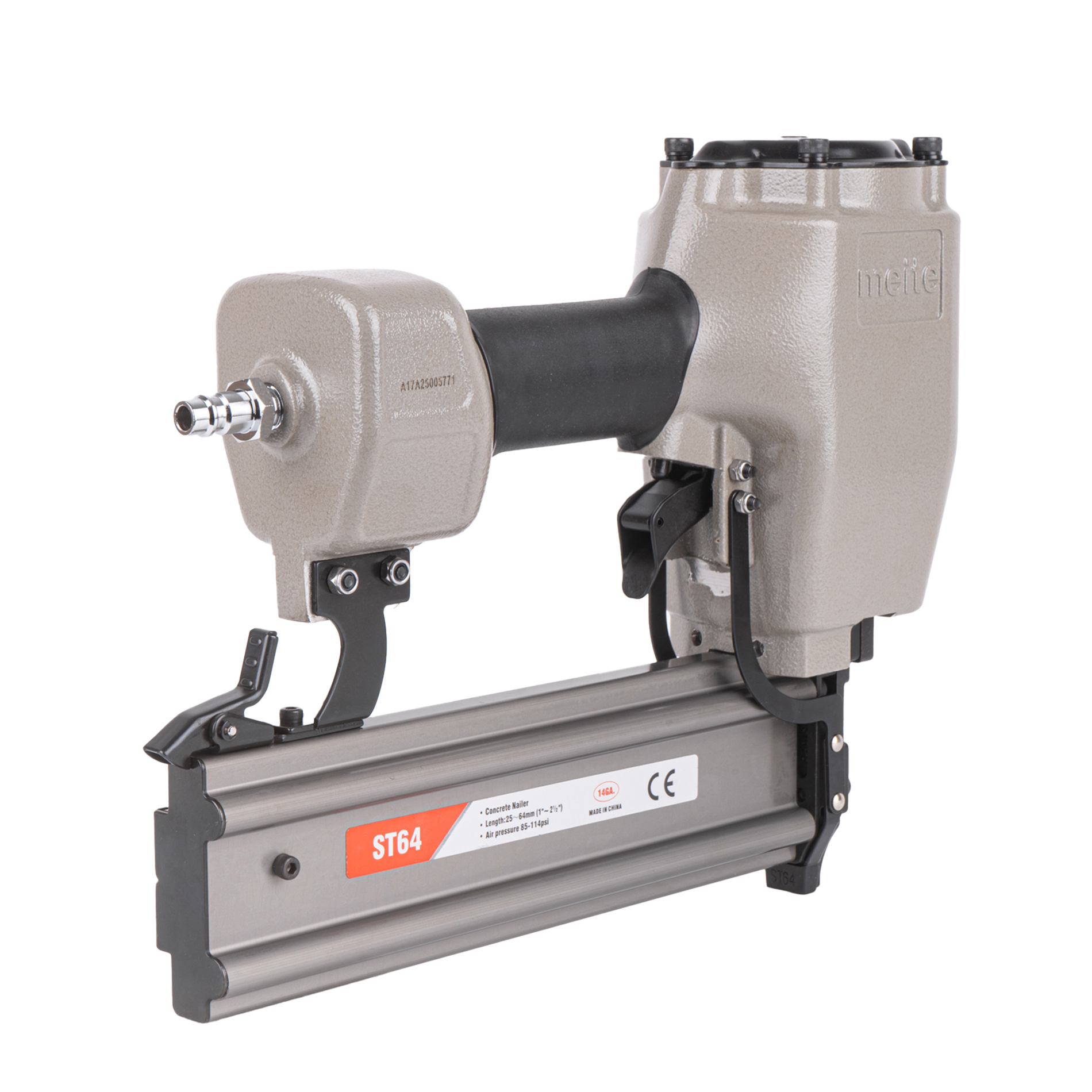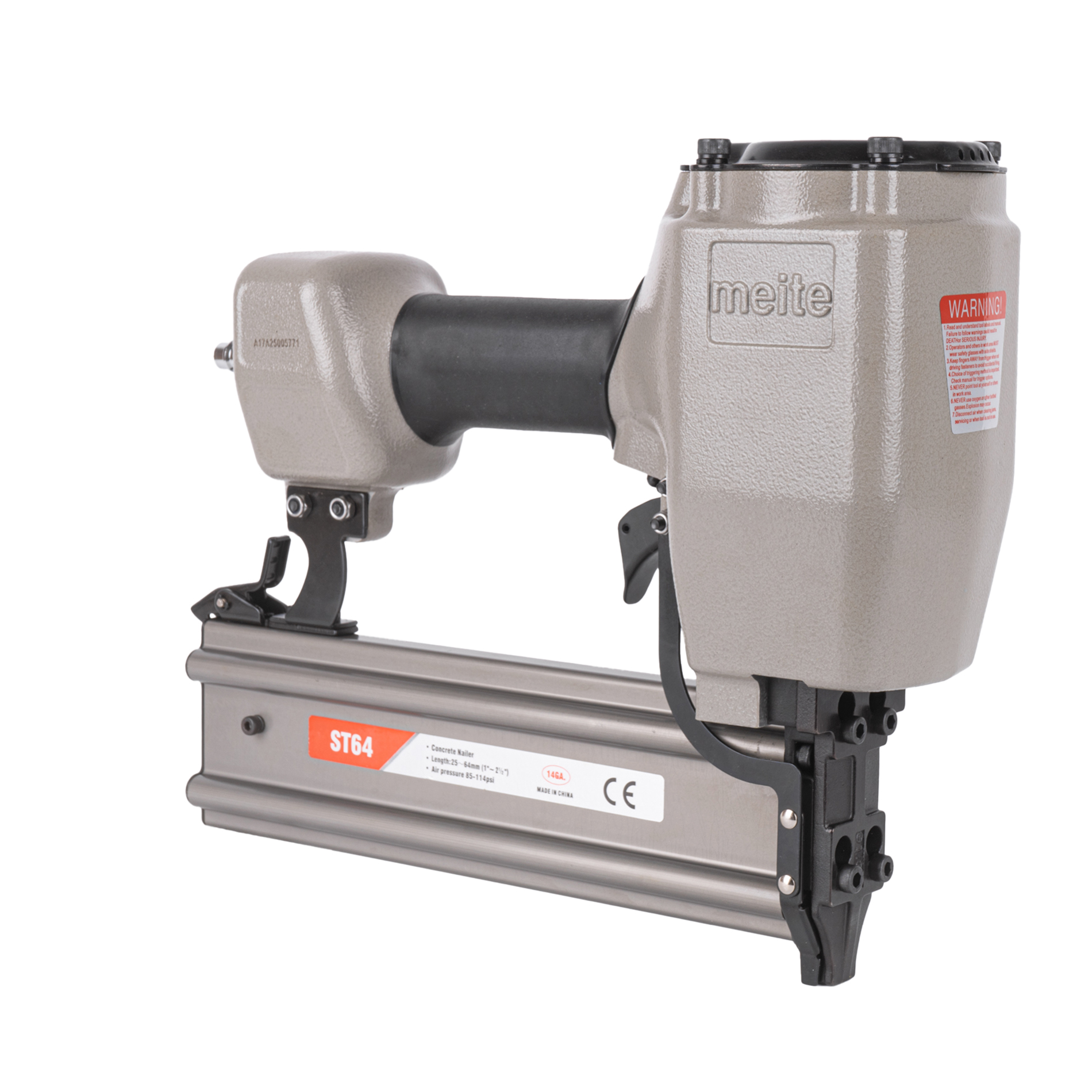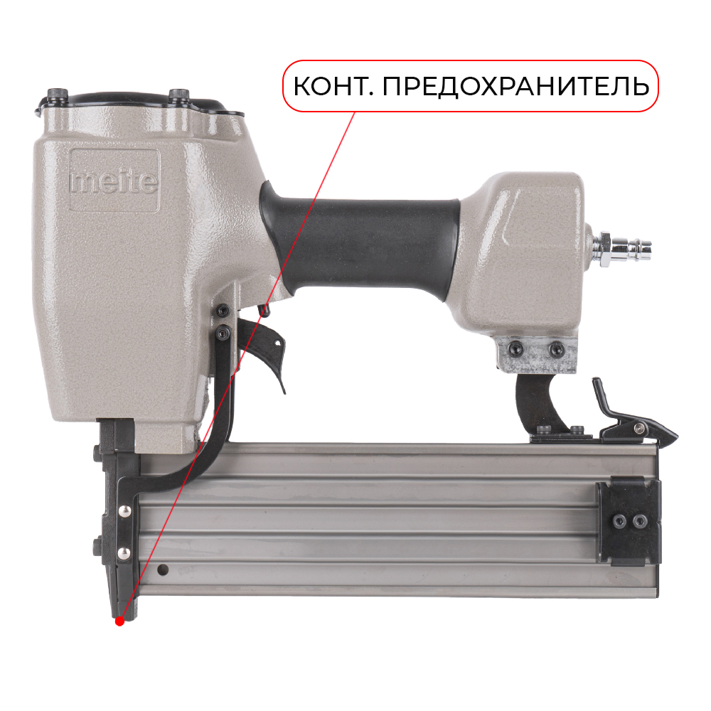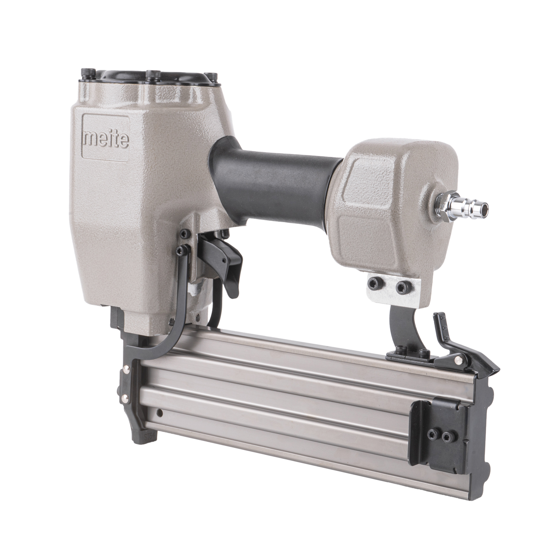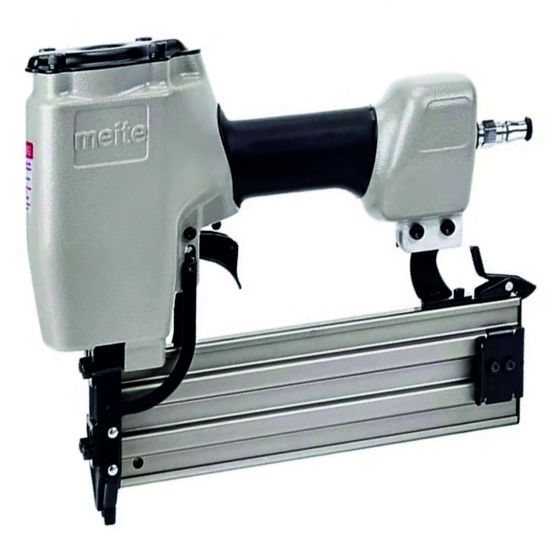 Пневмопистолет для забивания Т-гвоздей meite ST64 по бетону классическая модель проверенная временем. Данный нейлер пистолет характеризуется невысокой ценой при высоком качестве изготовления и эксплуатационого ресурса. Емкость магазина пневмопистолета - 50 T-гвоздей.