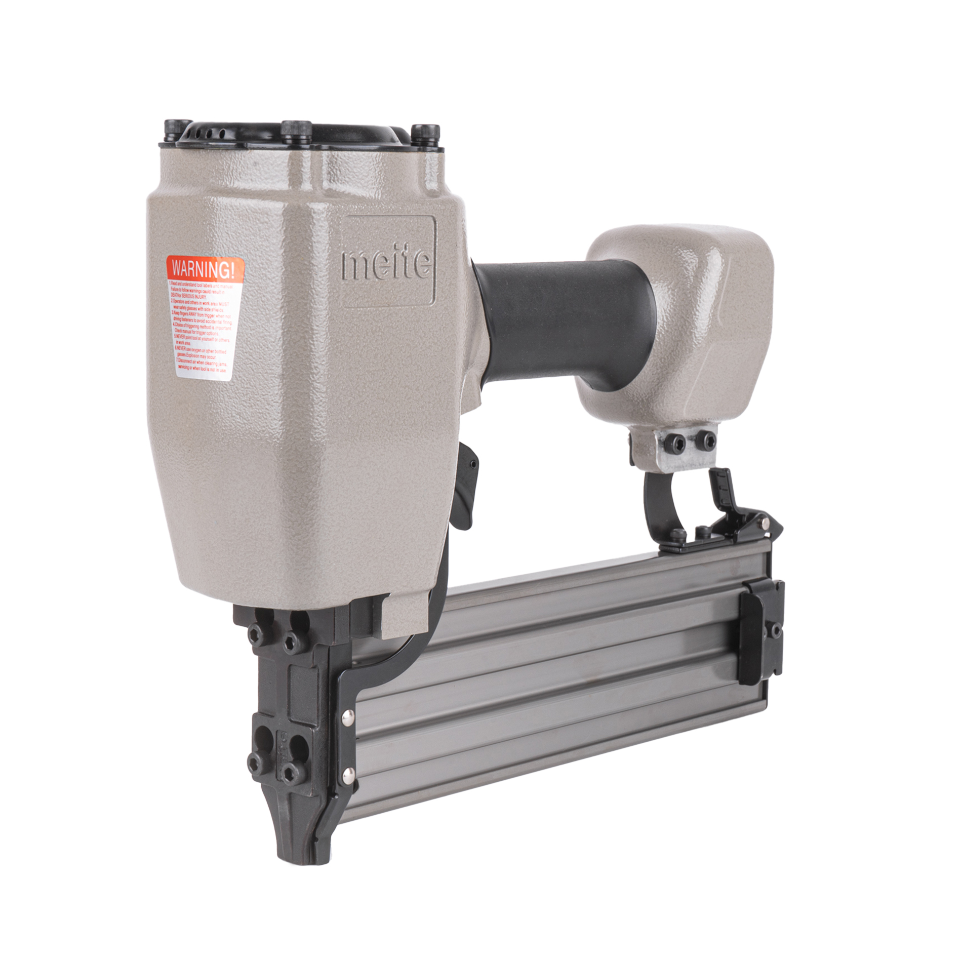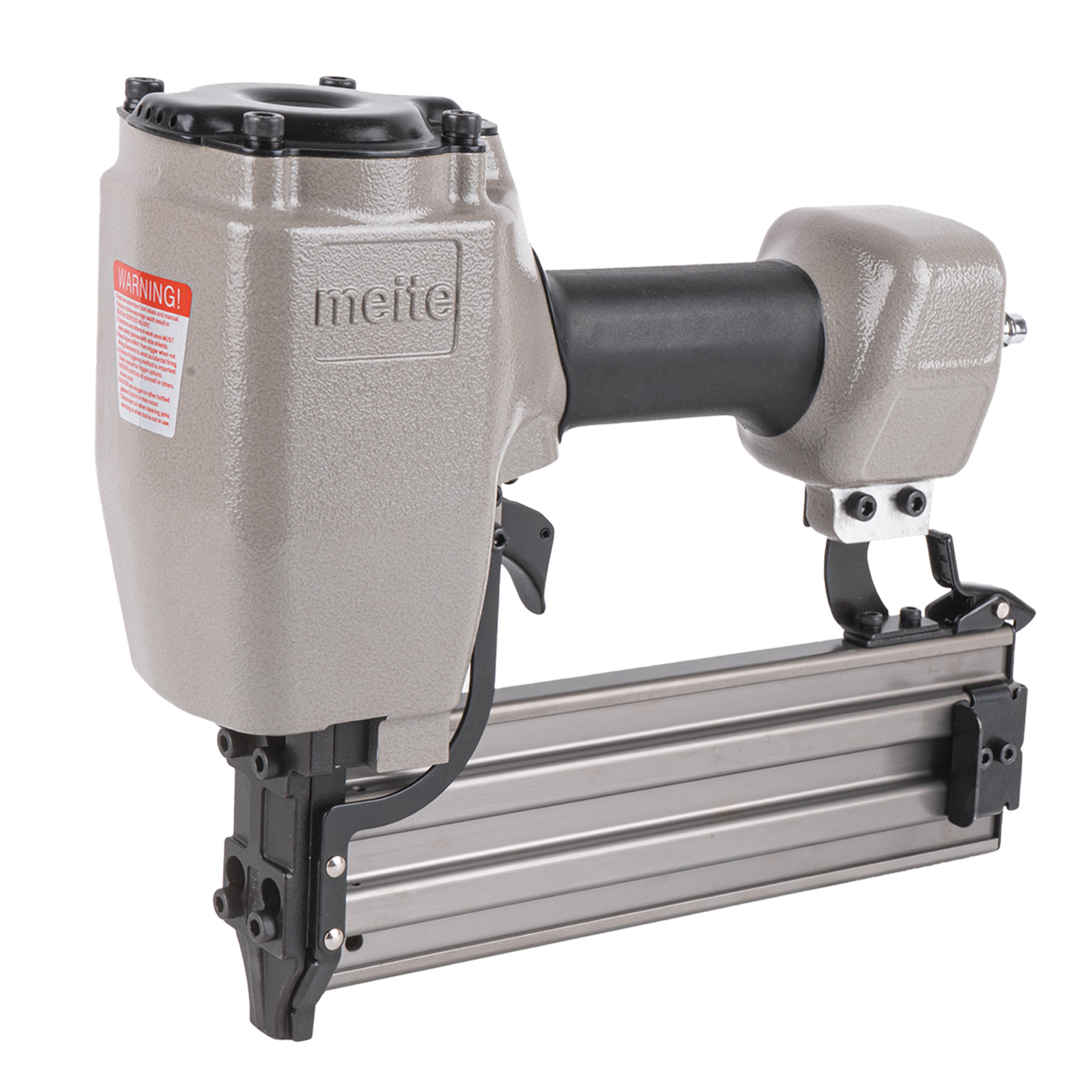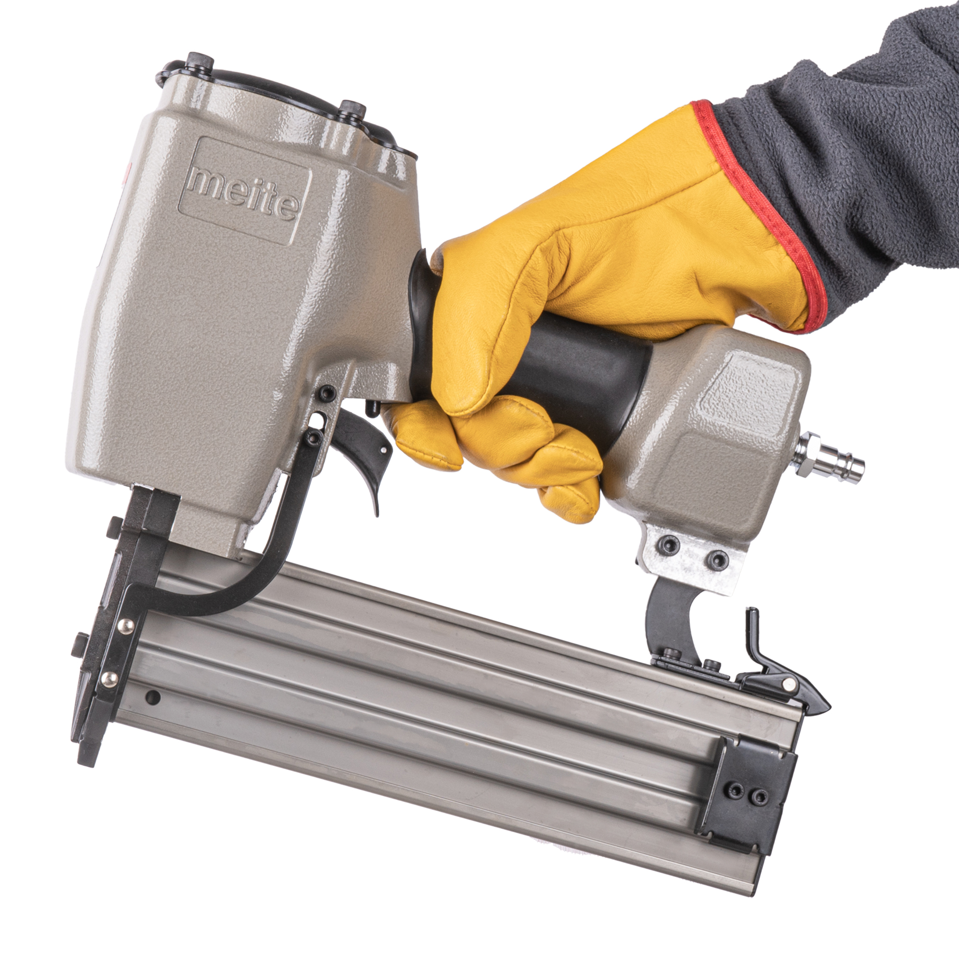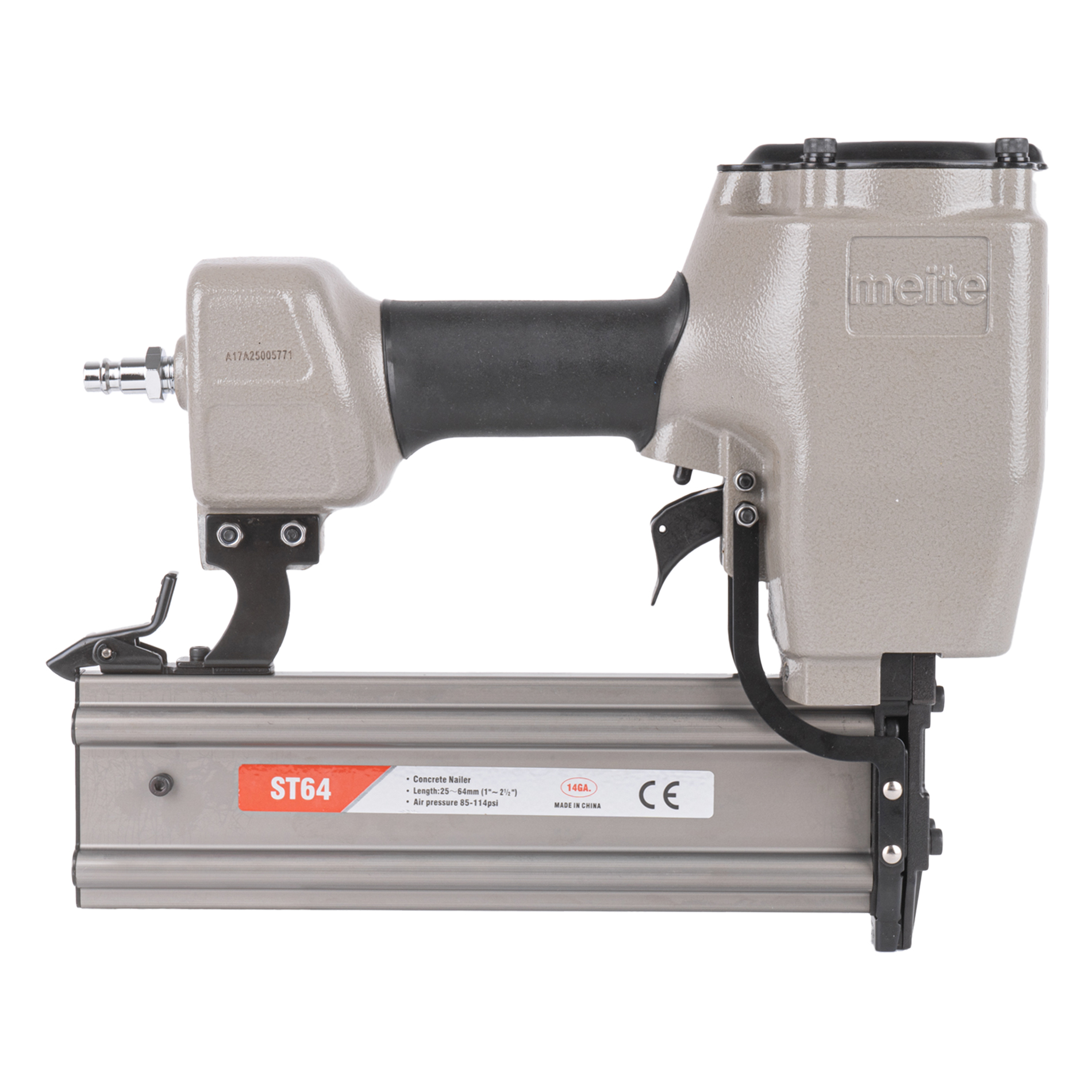 Пневмопистолет для забивания Т-гвоздей meite ST64 по бетону классическая модель проверенная временем. Данный нейлер пистолет характеризуется невысокой ценой при высоком качестве изготовления и эксплуатационого ресурса. Емкость магазина пневмопистолета - 50 T-гвоздей.