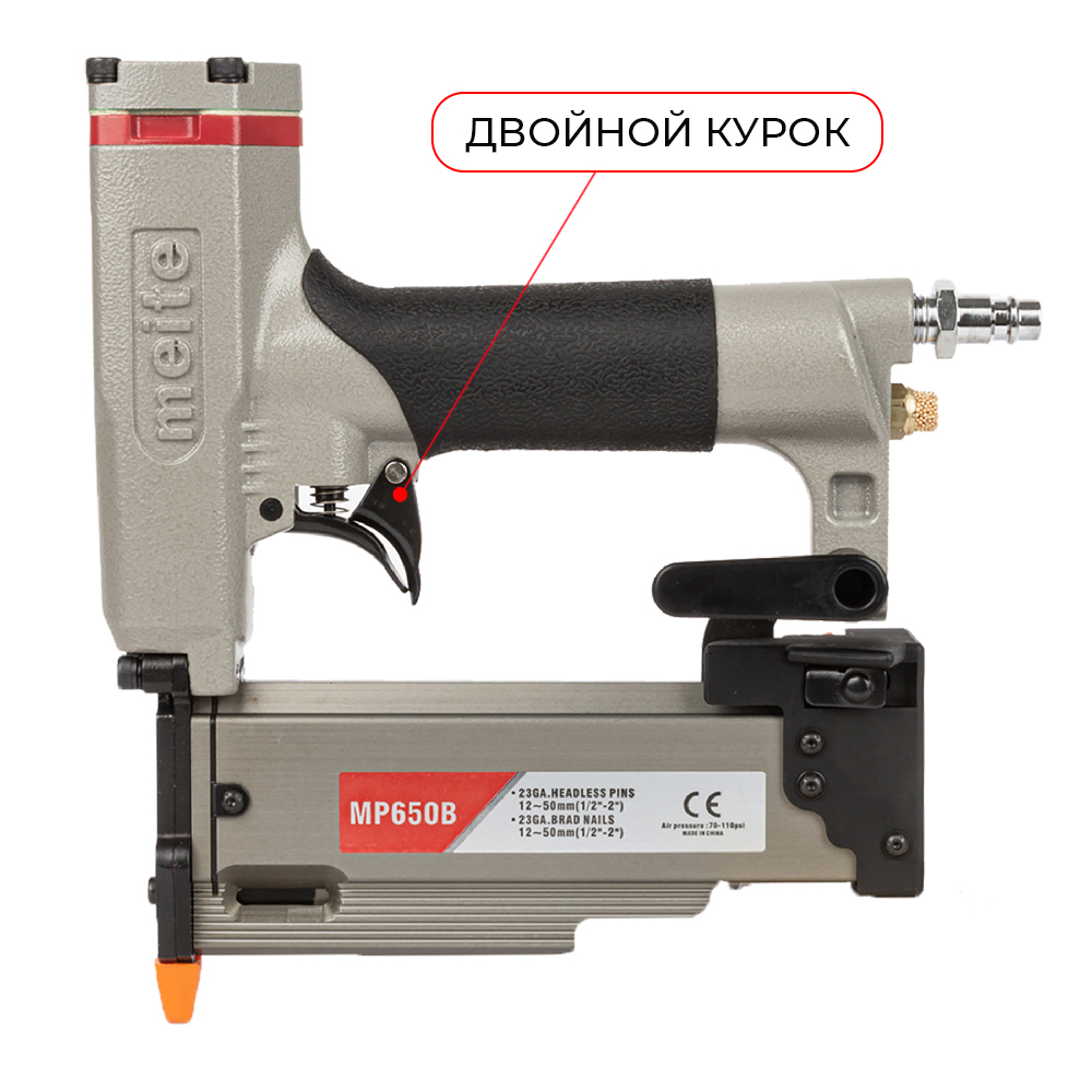 Пневматический шпилькозабивной пистолет meite MP650B предназначен для скрепления некрупных деталей из дерева или пластика и не несущих конструкций. Например, планки, штапики, изготовление картинных и деревянных оконных рам, монтаж молдинга и декора, требующих аккуратного внешнего вида готового изделия. Этот пневматический микрошпилечник применяется с микрошпильками 23GA, размером от 12 до 50 мм, которые используются для финишных работ, так как при вбивании не оставляют следа на поверхности.